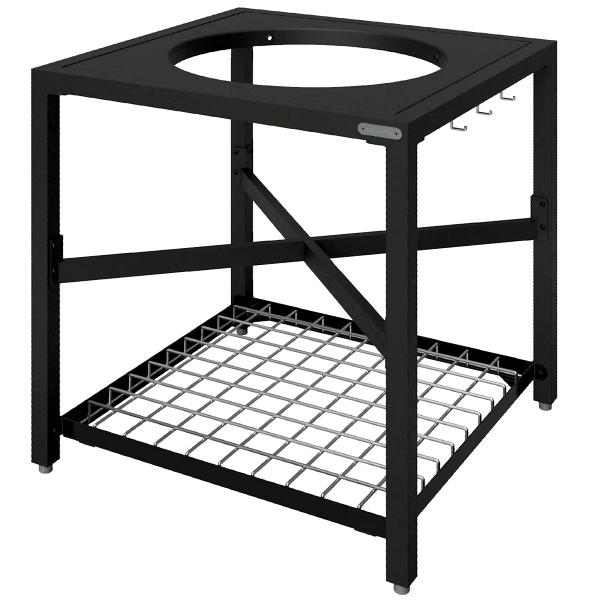 Das Untergestell bietet eine zweite Ebene für einen extra Edelstahlrost und eine Hakenleiste mit drei Haken für Küchenutensilien. Das Gestell aus pulverbeschichtetem Aluminium und Stahl ist ausgesprochen langlebig und korrosionsbeständig, gekreuzte Träger sorgen für maximale Stabilit
