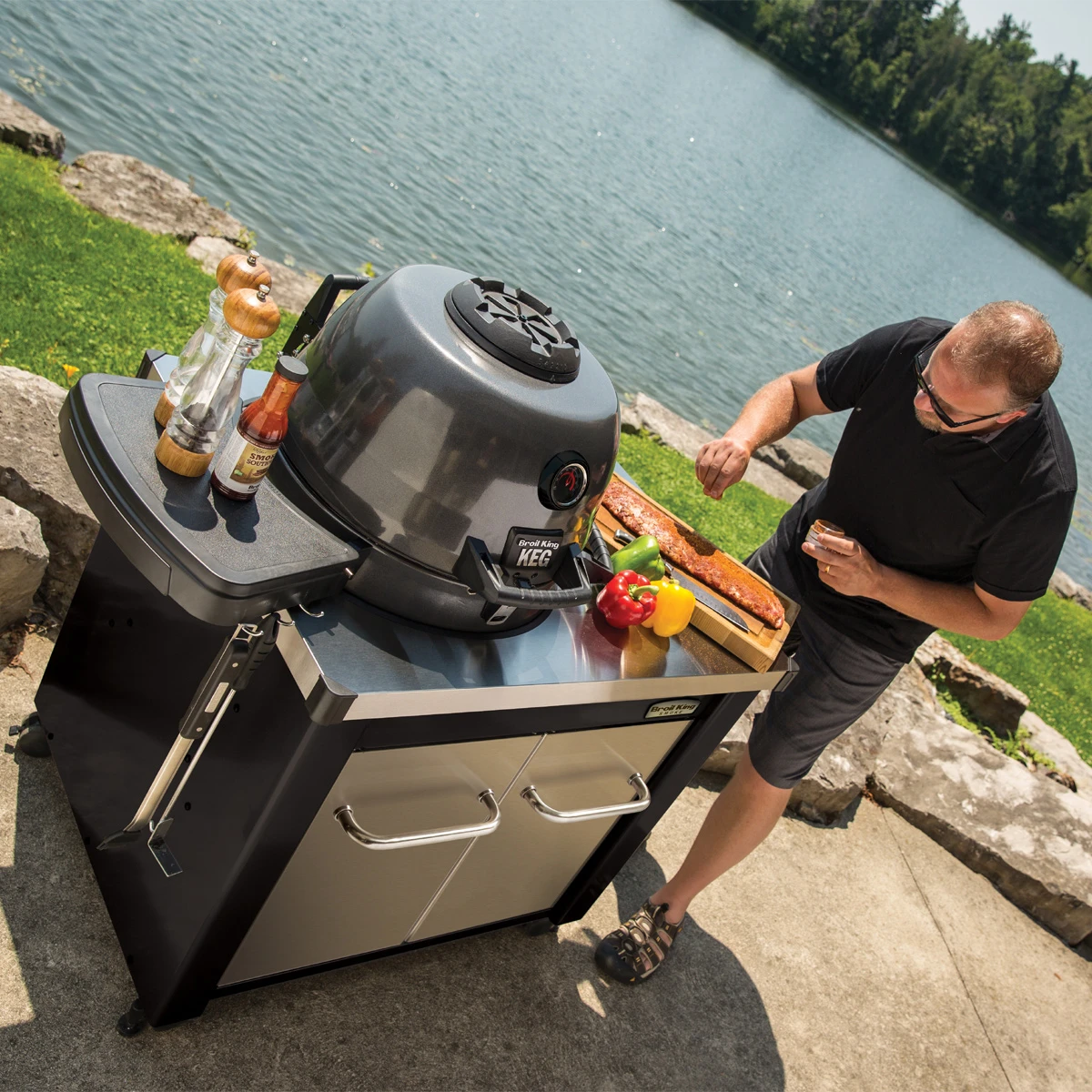 Verwandelt Euren Broil King KEG in eine komplette Outdoorküche. Hergestellt aus haltbarem Edelstahl mit einer stilvollen Arbeitsplatte, die Euch den Raum gibt, den Ihr benötigt, um das Essen direkt am Grill vorzubereiten. Der Unterwagen mit stabilen Türen und Griffen aus Edelstahl bietet Euch ausreichend Stauraum für die Notwendigkeiten am Grill. Die Auszugswanne ist perfekt für die Lagerung von Säcken mit Holzkohle oder Holzchips und Chunks.