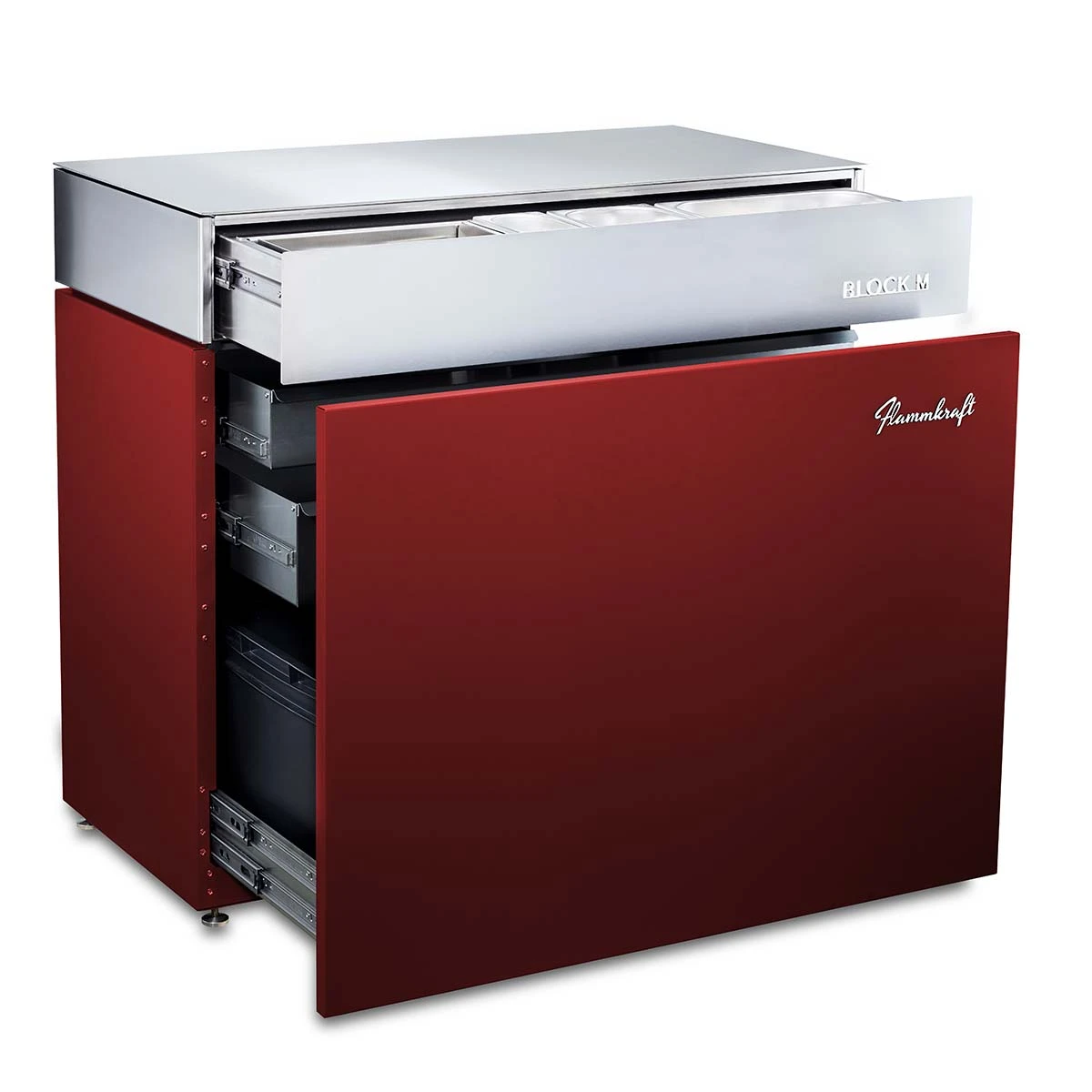 Der Block M ist ein aus 100% Edelstahl, in der Grundfläche entspricht er dem Block D und ist in den gleichen Farben erhältlich. Neben umfangreichen für Zubehör bietet der Block M einen Abfallbehälter und eine komfortable Lösung für die Vorbereitung und Bereitstellung von Zutaten.