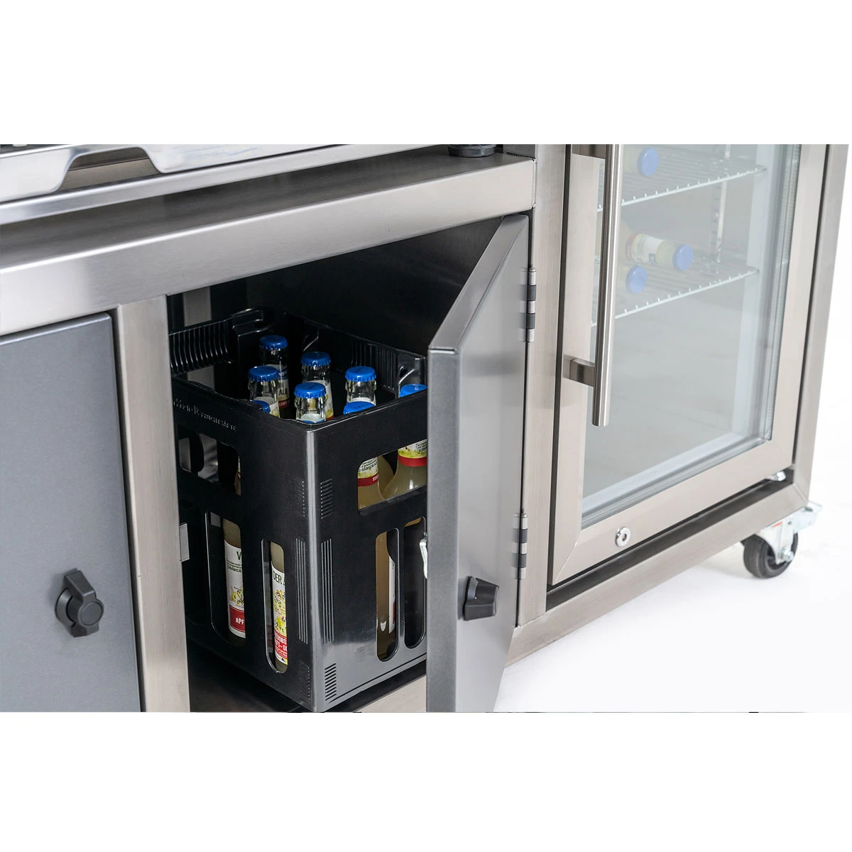 - Staufläche für Zutaten, Grillgut und Zubehör, welches hinter den dekorativen Fronten verschwindet