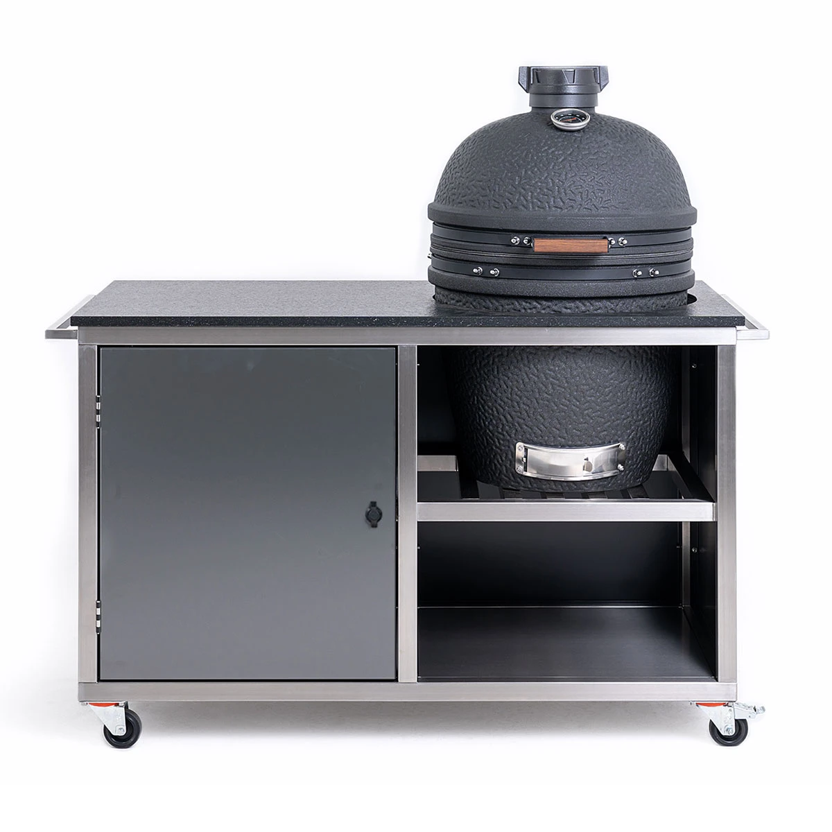 Mit dem Blackline Küchenmodul für Keramikgrills stattet Ihr Euren Keramikgrill mit einer , und aus. So seid Ihr bestens gerüstet, um an Eurem Keramikgrill noch kreativer zu experimentieren – mit viel Platz zum Schneiden, Würzen, Schnibbeln und Mischen auf der großen Granitarbeitsplatte. Im Inneren finden sich inklusive Edelstahl-Zwischenablagen reichlich Stauflächen für Zutaten, Grillgut und Gewürze sowie Unterbringungsmöglichkeiten für vielfältiges Grillzubehör oder den Holzkohlevorrat.