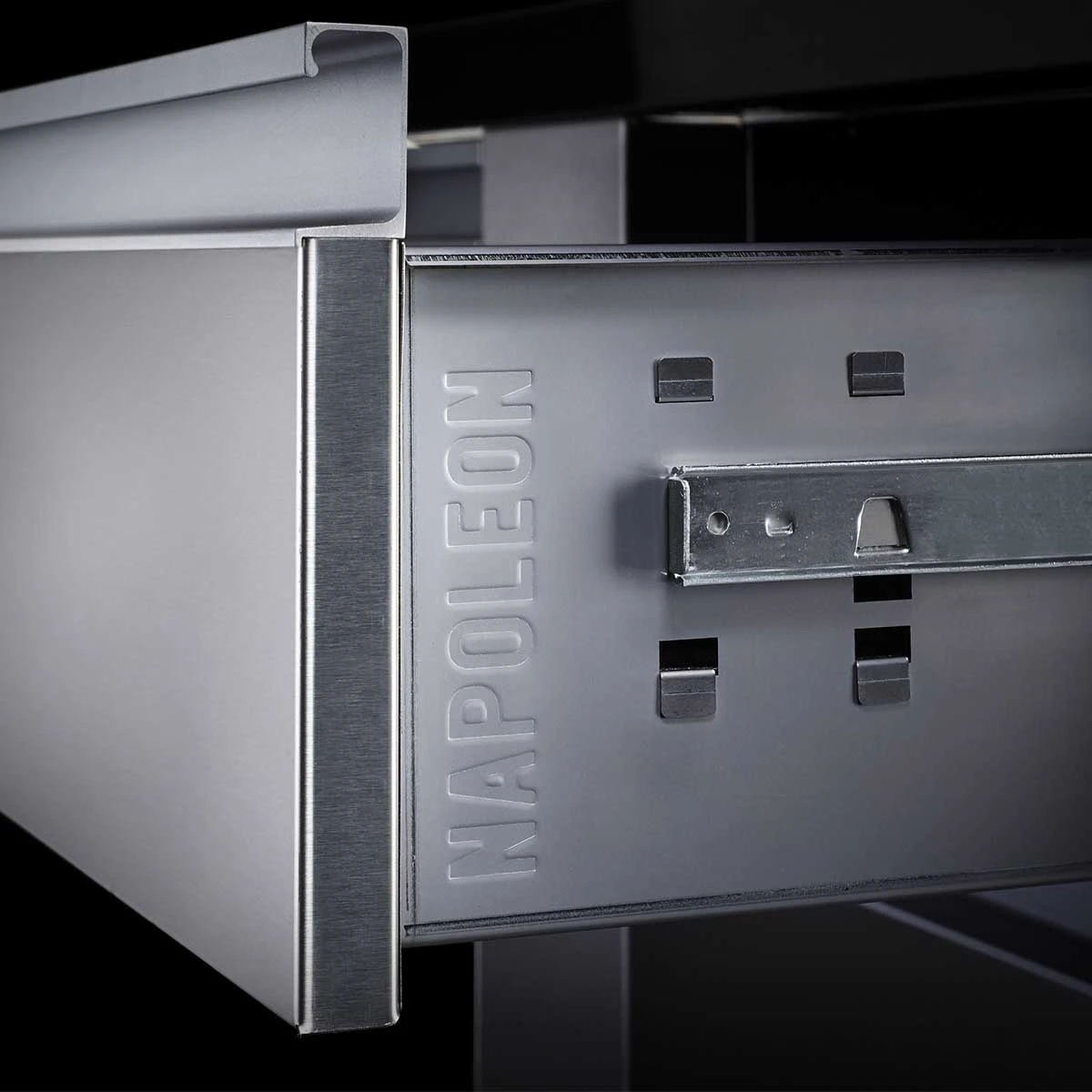 Alles untergebracht mit der Universallösung von Napoleon: Links besteht ausreichend Platz für z.B. die Gasflasche, rechts befinden sich drei Schubladen zum Verstauen von Grillutensilien.Die Schubladen und die Türe sind mit Softclose-Funktion ausgestattet.