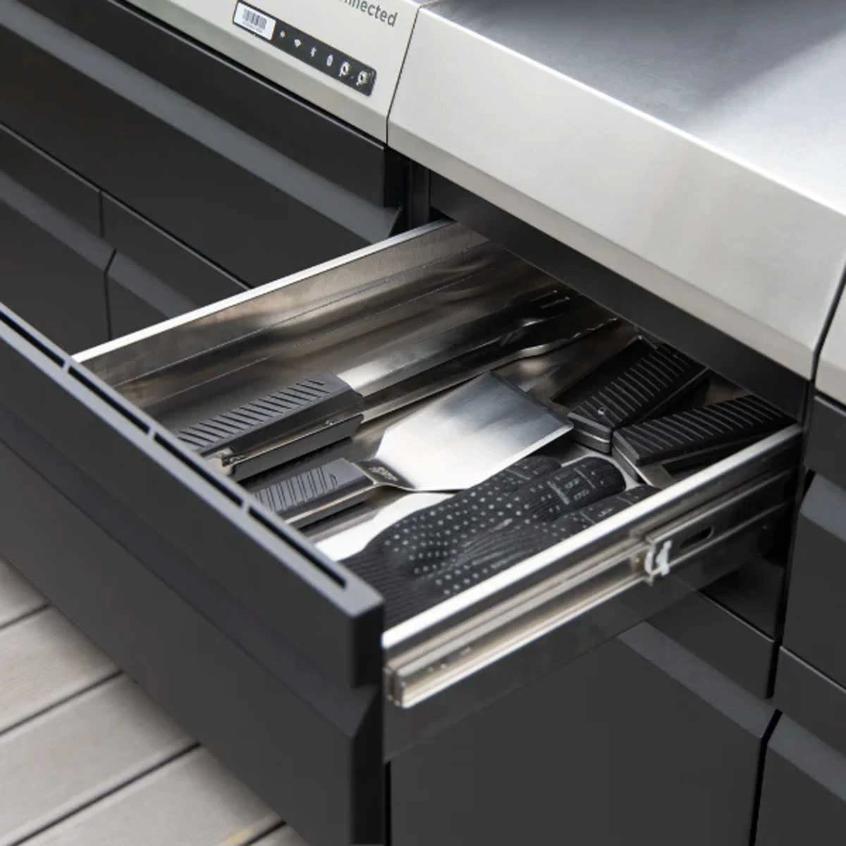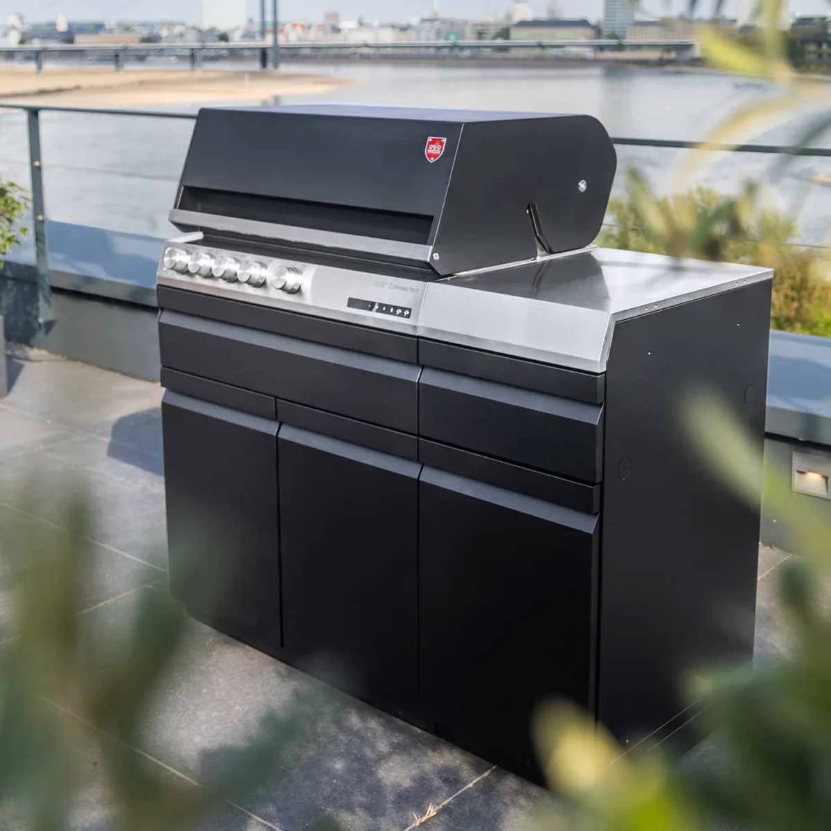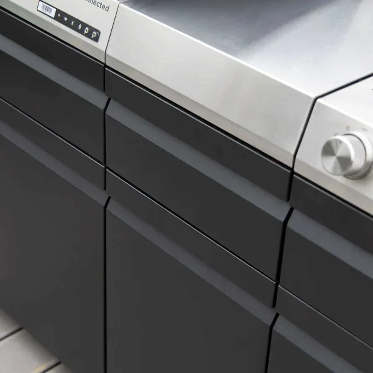 Sämtliche Module sind komplett aus hochwertigem gefertigt, die halten Wind und Wetter stand – für einen langlebigen Outdoorküchen-Traum im einheitlichen . Dabei lassen auch die Details einen hohen Anspruch an und erkennen: Türen und Schubladen mit SoftCloseTechnik, Arbeitsflächen aus gebürstetem Edelstahl, clevere Stauraum-Lösungen und unempfindliche Oberflächen bieten den Luxus, den Ihr Euch für Eure Grilloase gönnen wollt.